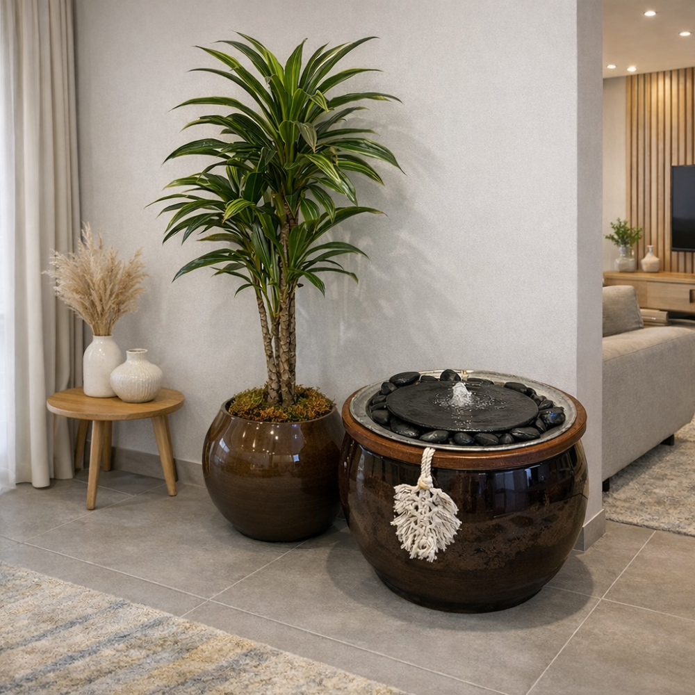 التصميم مصمم بطريقة معينة وخاصة تمنع صدور الأصوات المزعجة من النافورة آو تكون الطحالب والروائح وركود الماء كونها نافورة داخلية .