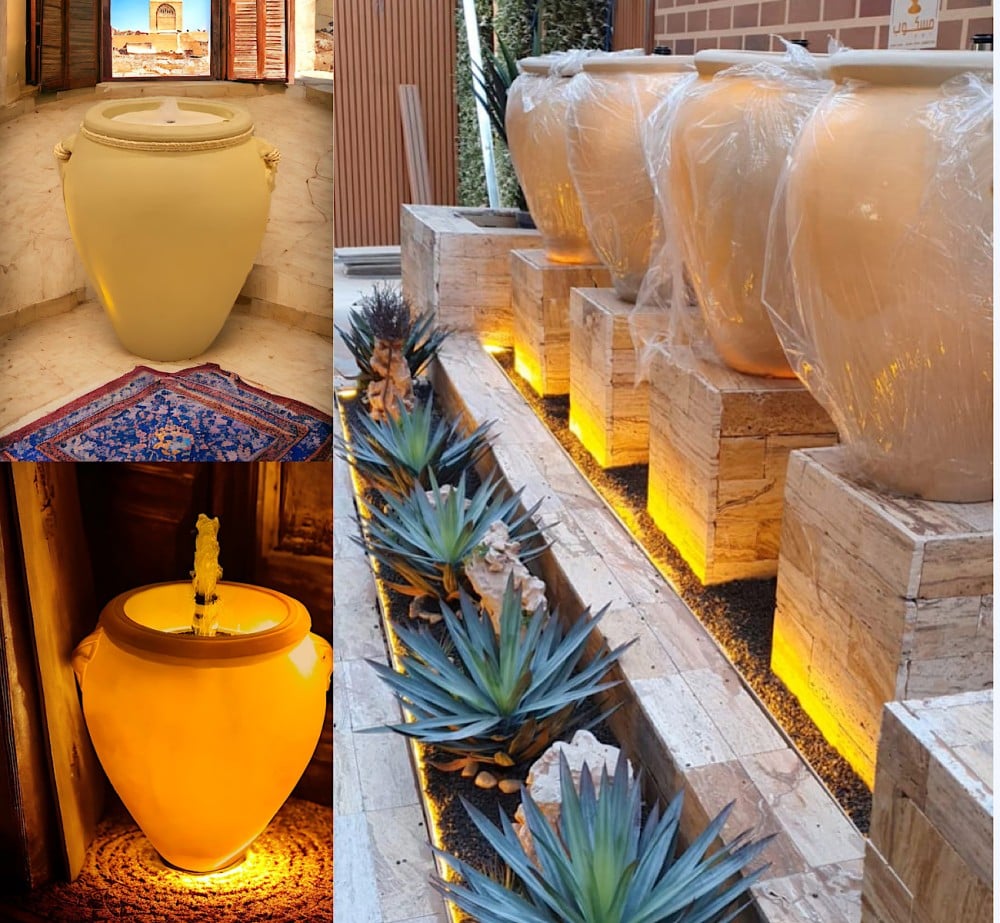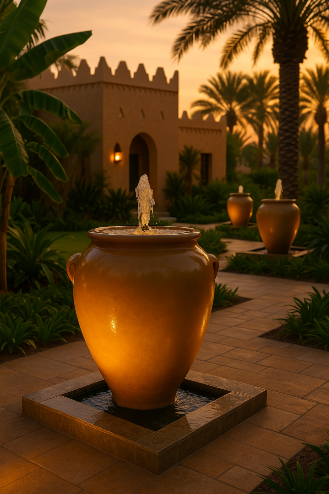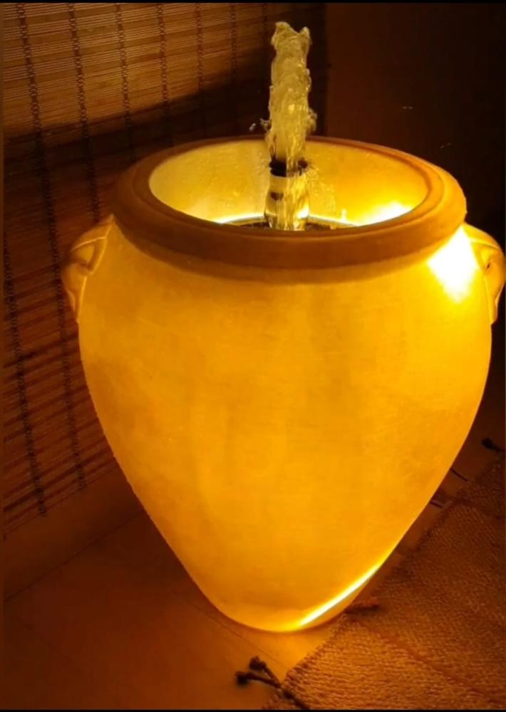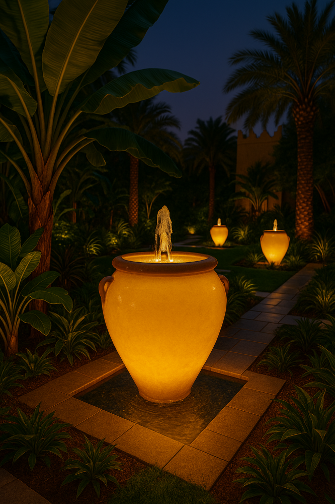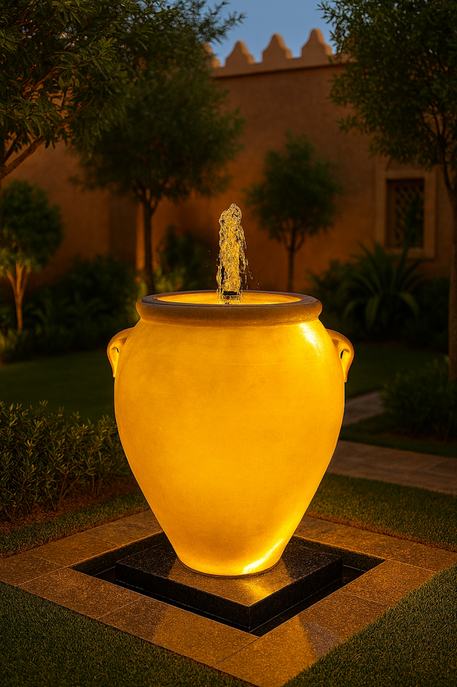 نافورة جرة مضيئة بتصميم فاخر تضيف هدوءًا بصريًا ولمسة ديكور راقية للحدائق والفناءات ومداخل الفلل. بارتفاع 80 سم وقطر 70 سم، تمنح حضورًا أنيقًا ومتوازنًا في أي مساحة خارجية